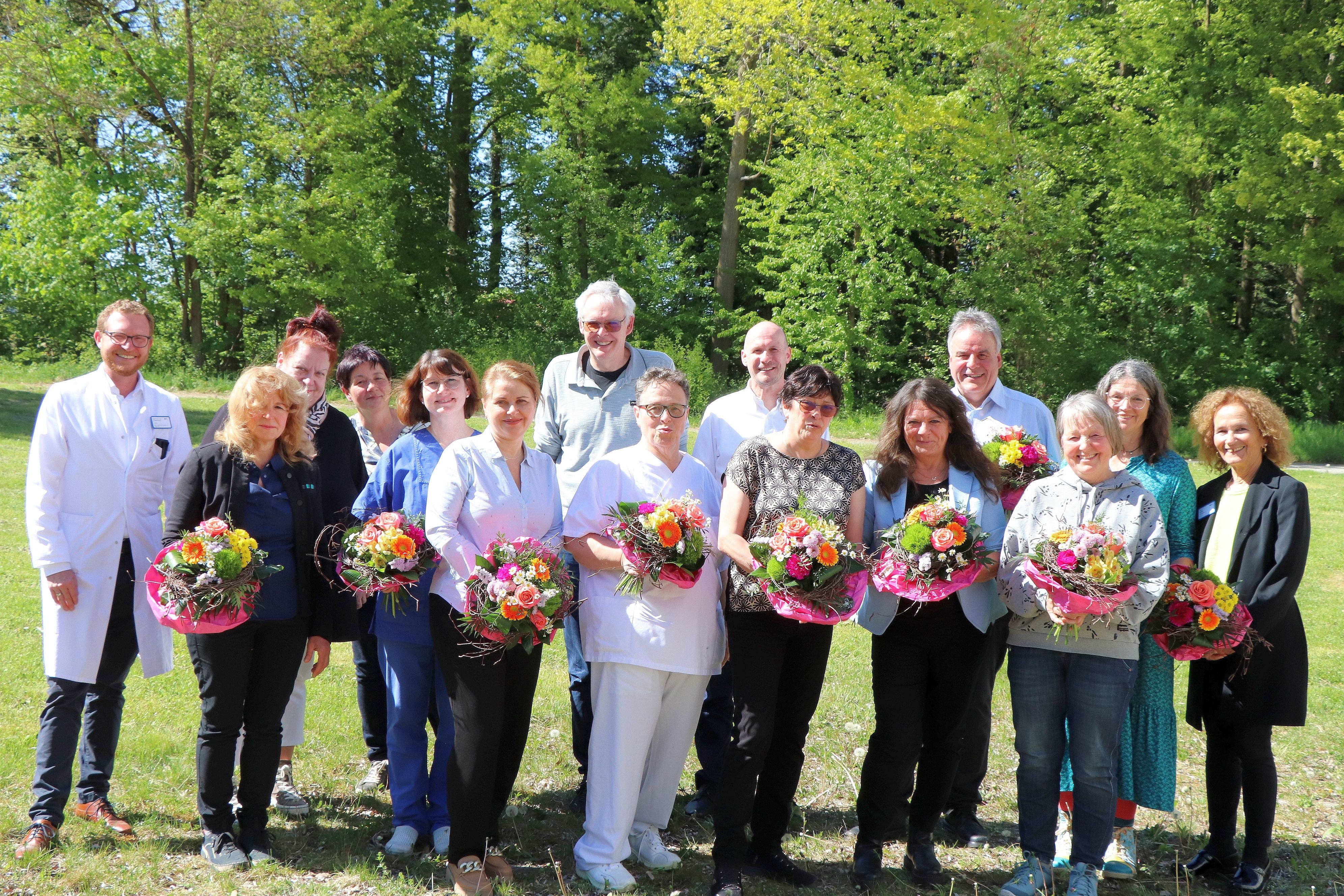 Seit vielen Jahren halten sie dem MCB die Treue - nun wurden 25 Mitarbeitende des MCB für ihre jahrzehntelange Betriebszugehörigkeit ausgezeichnet. Im Rahmen einer Feierstunde in der Mitarbeitercafeteria des Klinikums Friedrichshafen erhielten die Dienstjubilare aus den Händen von Prof. Dr. Ludwig Oberkircher (Stellvertretender Medizinischer Direktor des MCB) und Pflegedirektorin Claudia Keller einen bunten Blumenstrauß, eine Urkunde und einen Gutschein.