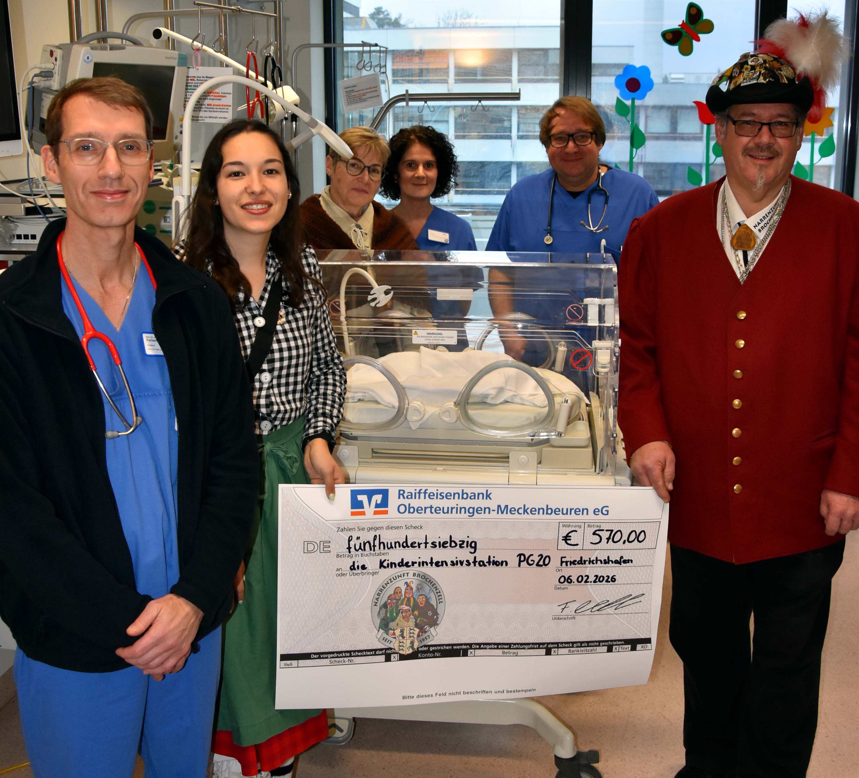 Die Narrenzunft Brochenzell ist mit ihren vier Gruppen ein gern gesehener Gast im bunten närrischen Miteinander, auch wenn sie kein Geschenk mitbringt. Seit geraumer Zeit sammeln die Brochenzeller Narren das Geld, um „eine gemeinnützige Sache“ zu unterstützen – in diesem Jahr die Klinik für Kinder und Jugendliche Friedrichshafen mit einer Spende über 570 Euro.