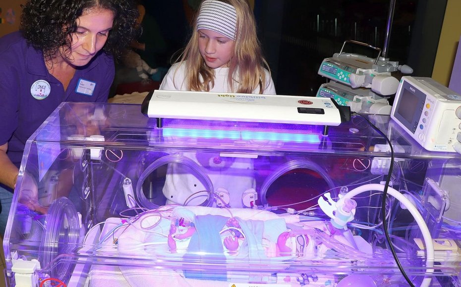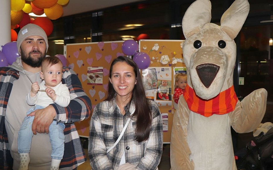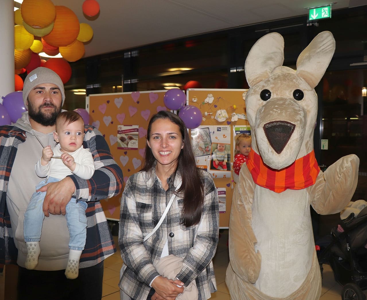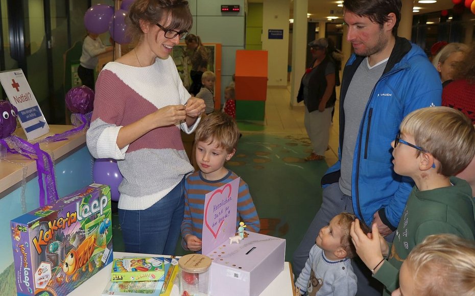 Lila - die weltweite Farbe für Frühchen („Purple for Preemies“) dominiert an diesem Tag das Foyer des Mutter-Kind-Zentrums (Mukiz) des Klinikums. Überall sitzen, stehen und hängen lilafarbene selbst gehäkelte Tintenfische von der Organisation „Oktopus für Frühchen Deutschland“. Der niedliche Oktopus, positioniert im Bettchen in Greifnähe des Frühchens, soll den Säugling von den Schläuchen und Sonden ablenken. Der bereits stark ausgeprägte Greifreflex soll nicht an Kabeln und Schläuchen ausprobiert werden, sondern an den langen Tentakeln des kleinen Tintenfisches.