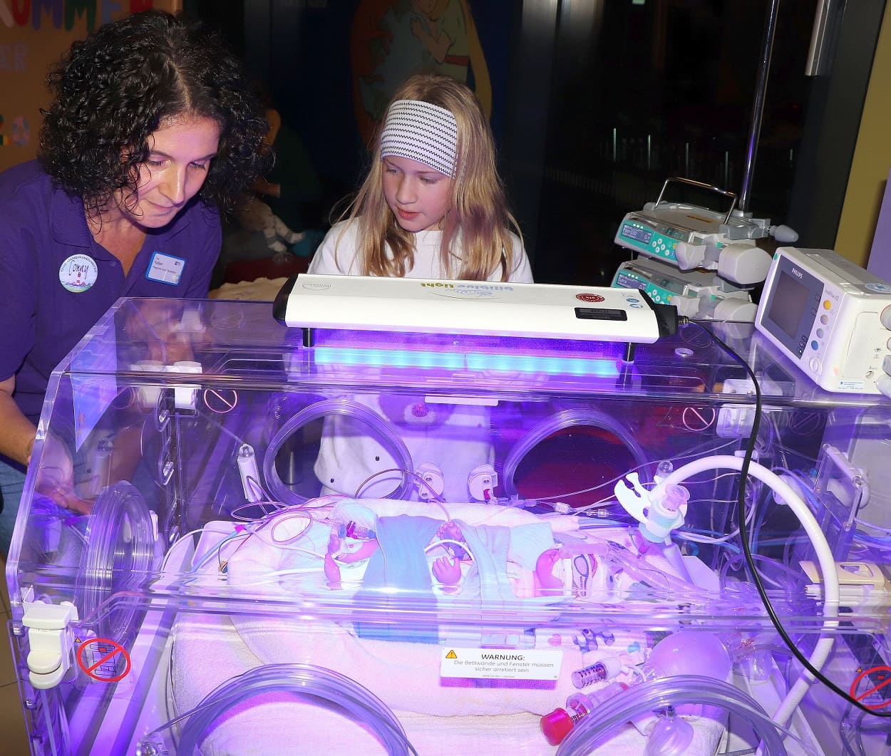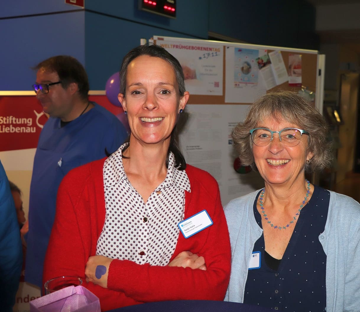 Neben Ärzten und Pflegekräften der PG 20, der neonatologischen Intensivstation, sind zahlreiche Eltern, deren Baby in diesem Jahr oder in den Jahren zuvor zu früh auf die Welt gekommen ist und im Mukiz betreut wurde, gekommen. So flitzen die Zwillinge Matteo und Ben, vor zwei Jahren zehn Wochen zu früh auf die Welt gekommen, mittlerweile putzmunter durch das Foyer und entern das große Holzschiff. Überall herrscht eine entspannte warme Atmosphäre. Bei Kaffee und Kuchen tauschen sich die Eltern untereinander aus, freuen sich, das engagierte Pflegeteam der PG 20 wiederzusehen.