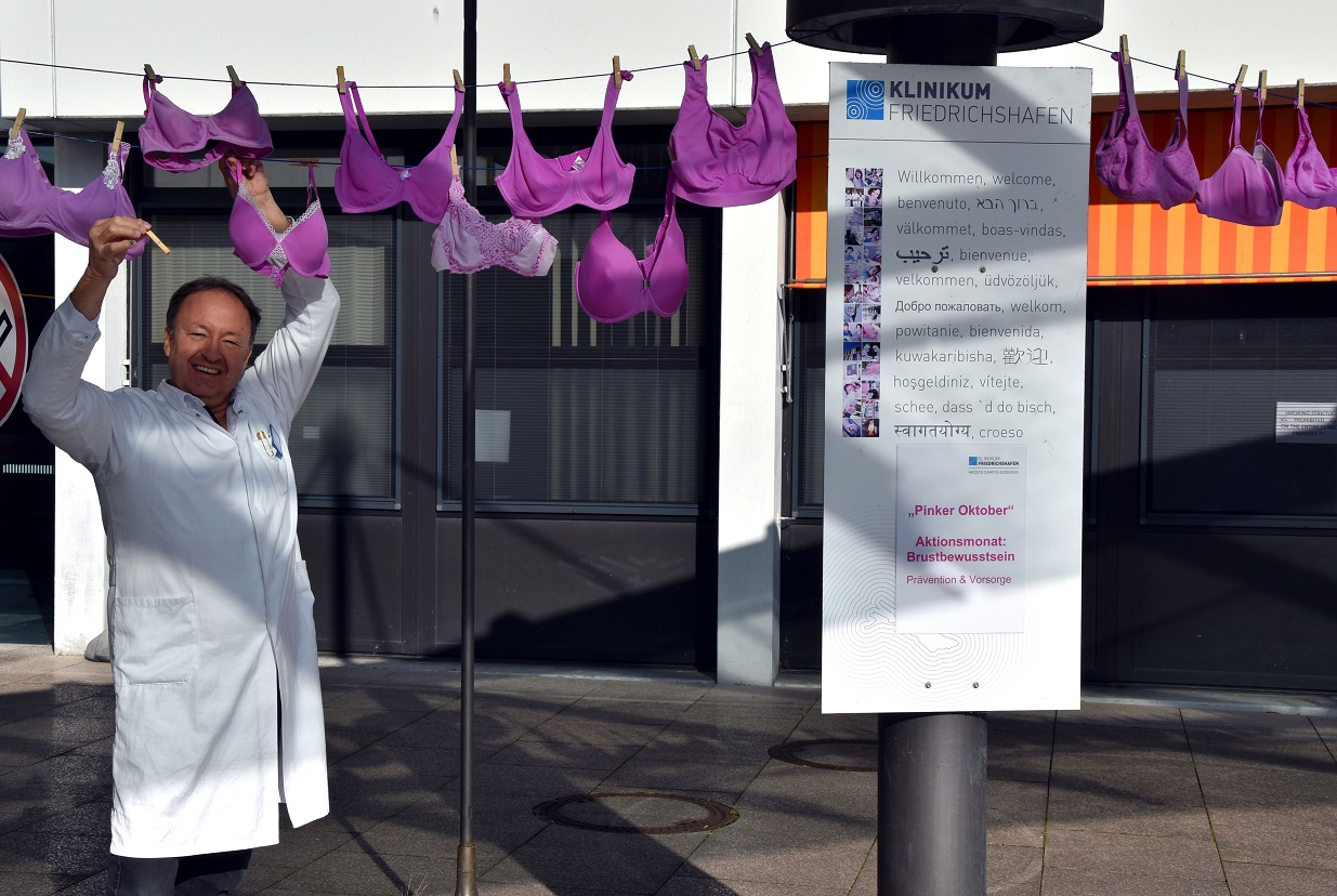 Sie will aufmerksam machen auf den „Pinktober“ – weltweit soll dieser für Aufklärung und Sensibilisierung in der Gesellschaft zum Thema Brustkrebs sorgen. Die pinken BHs sind somit ein weithin sichtbarer Bestandteil dieser Aktion. Über Monate hinweg wurden dafür BHs gesammelt und gespendet von Mitarbeitenden, aber auch Soroptimistinnen und anderen Unterstützenden. Dr. Hans-Walter Vollert, Chefarzt der Klinik für Gynäkologie und Geburtshilfe des Klinikums Friedrichshafen, hatte die Idee dazu und freut sich auch über die große Unterstützung der Druckerei Gresser Meckenbeuren, die all die unterschiedlichen Büstenhalter gefärbt hat.